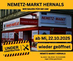 NUR IN HERNALS Sa, 18.10.2025 + Mo, 20.10.2025 + DI, 21.10.2025 Filiale wegen Umbau geschlossen ab Mi, 22. Oktober 2025 eröffnen wir im neuen Glanz für Sie!